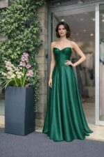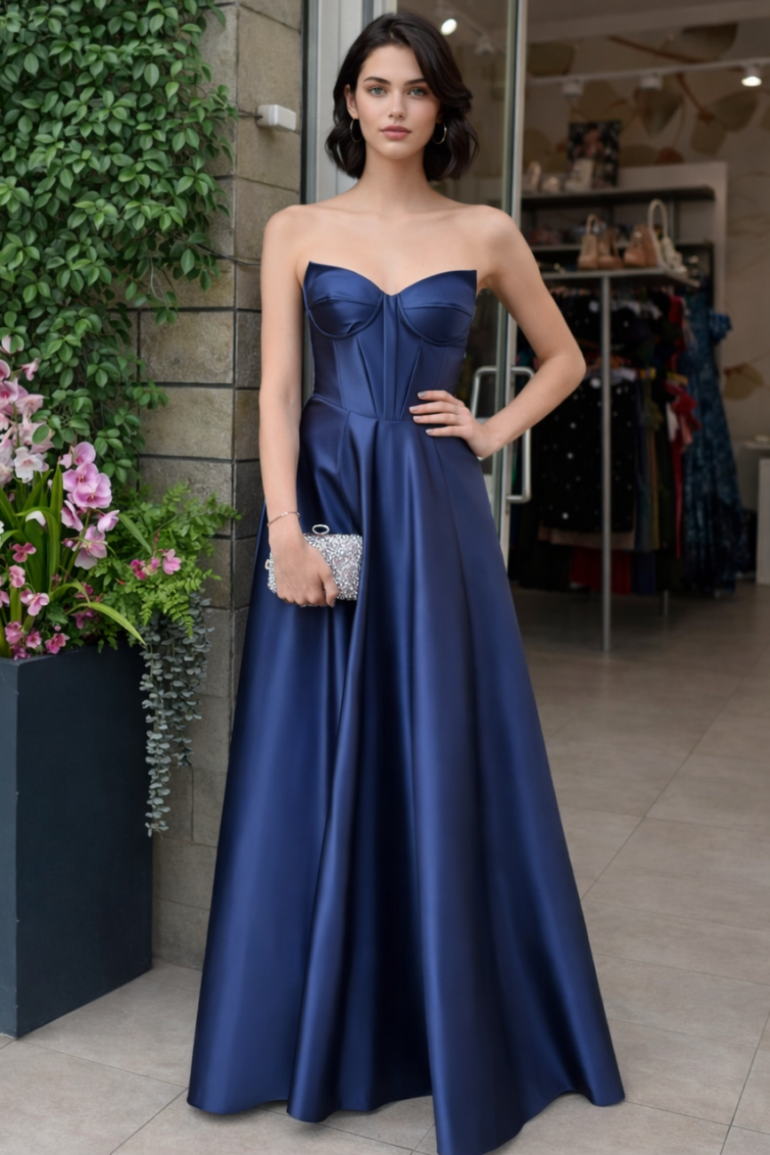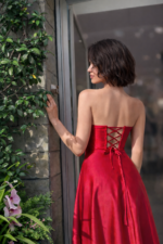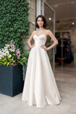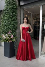 Il corpetto leggermente strutturato con scollo a cuore valorizza il décolleté e definisce il punto vita, mentre la gonna ampia e fluida crea un movimento armonioso ad ogni passo.