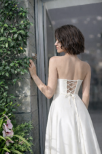 Il tessuto mikado, compatto e luminoso, dona struttura senza appesantire, rendendo questo modello perfetto per damigelle, diciottesimo, invitate a matrimonio e cerimonie importanti.