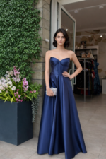 Un abito lungo in mikado dal carattere deciso e raffinato, pensato per chi desidera una presenza elegante ma moderna.