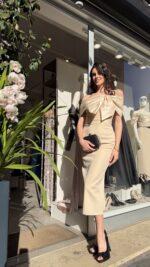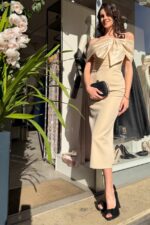 Abito Midi da Cerimonia Beige Nude con Maxi Fiocco Off Shoulder