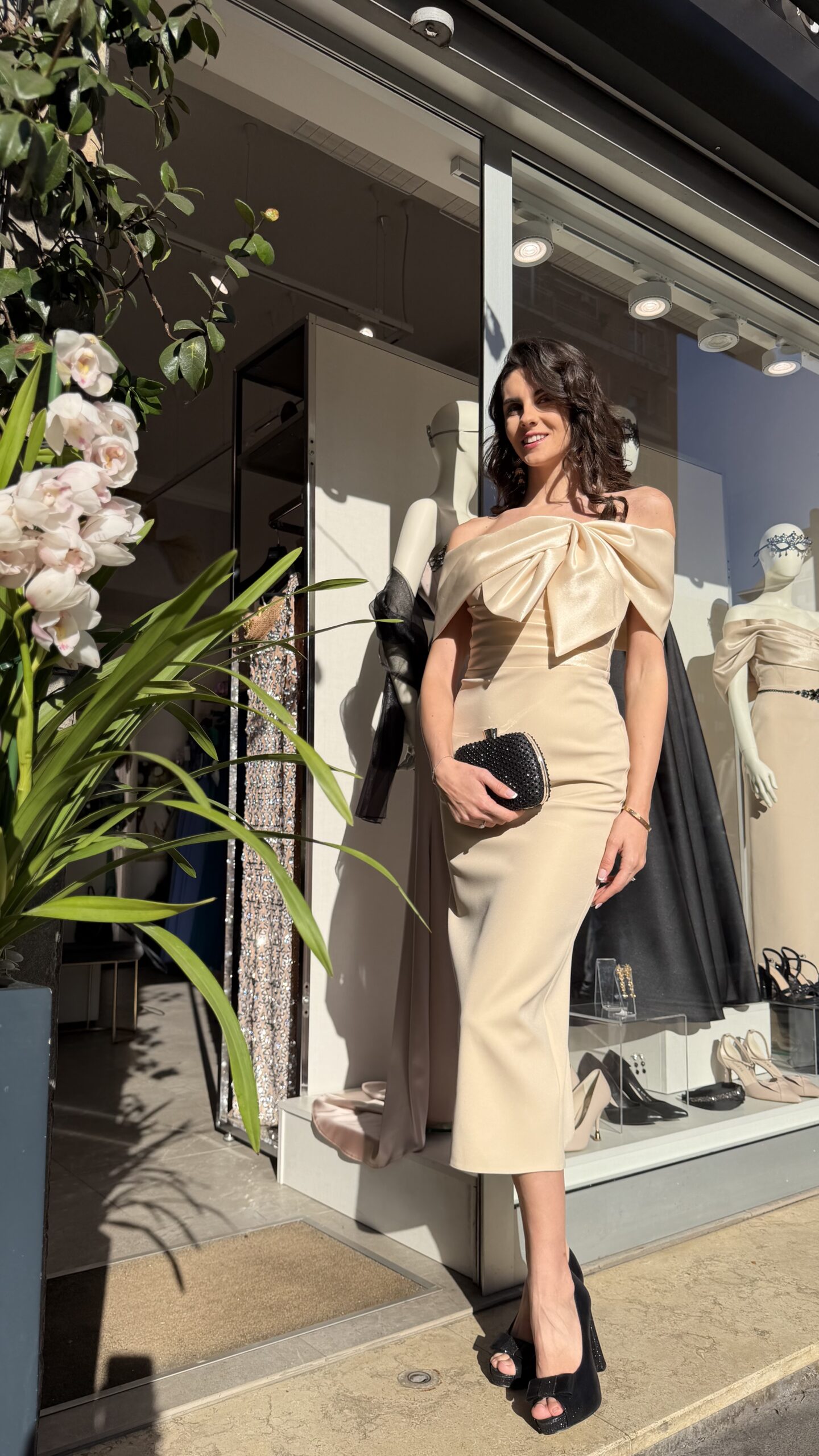 Abito da cerimonia color beige nude champagne, pensato per valorizzare la silhouette con una linea femminile e raffinata. Il design off shoulder con maxi fiocco strutturato sul décolleté crea un effetto scenografico ma armonioso, ideale per matrimonio, eventi eleganti, mamma della sposa o dello sposo.