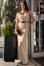 Abito da cerimonia lungo dal taglio a sirena, pensato per valorizzare la silhouette con linee pulite e femminili. Il design monospalla con drappeggio strutturato sul décolleté crea un effetto sofisticato e moderno, perfetto per eventi eleganti, matrimoni e serate speciali.